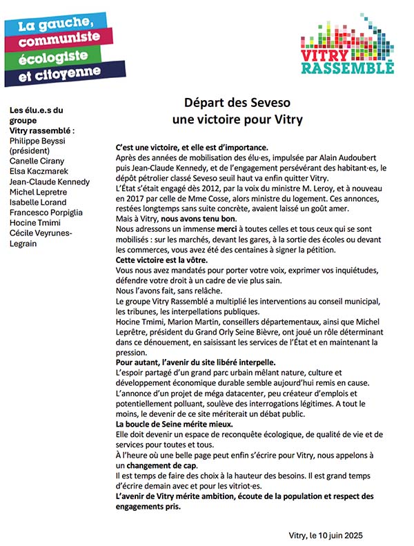À tout le moins, le devenir de ce site mériterait un débat public. La boucle de Seine mérite mieux. Elle doit devenir un espace de reconquête écologique, de qualité de vie et de services pour toutes et tous. À l’heure où une belle page peut enfin s’écrire pour Vitry, nous appelons à un changement de cap. Il est temps de faire des choix à la hauteur des besoins. Il est grand temps d’écrire demain avec et pour les vitriot·es. L’avenir de Vitry mérite ambition, écoute de la population et respect des engagements pris.