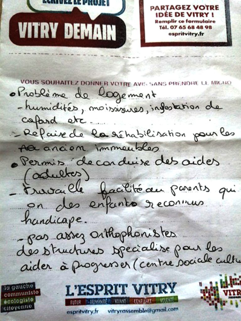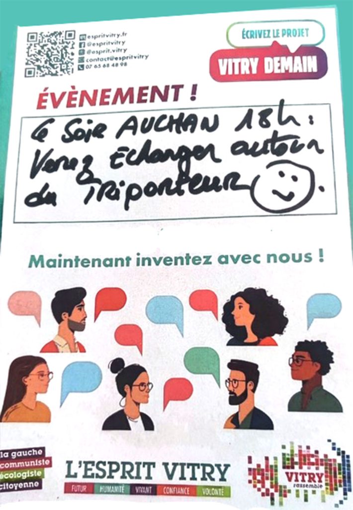 Il en ressort une chose essentielle : il y a dans Vitry une attente, un potentiel, une espérance. Le message est clair, profond, parfois dur mais toujours plein d’attachement pour notre ville. Nous poursuivrons dans les mois qui viennent la construction de cet espace d’expression, de confiance et d’élaboration partagée. Avant on écrivait le programme et on vous disait « votez pour nous ». Avec Vitry Demain, vous écrivez le programme avec nous.